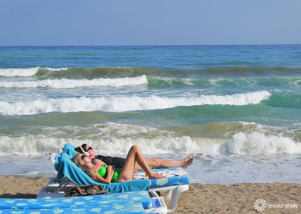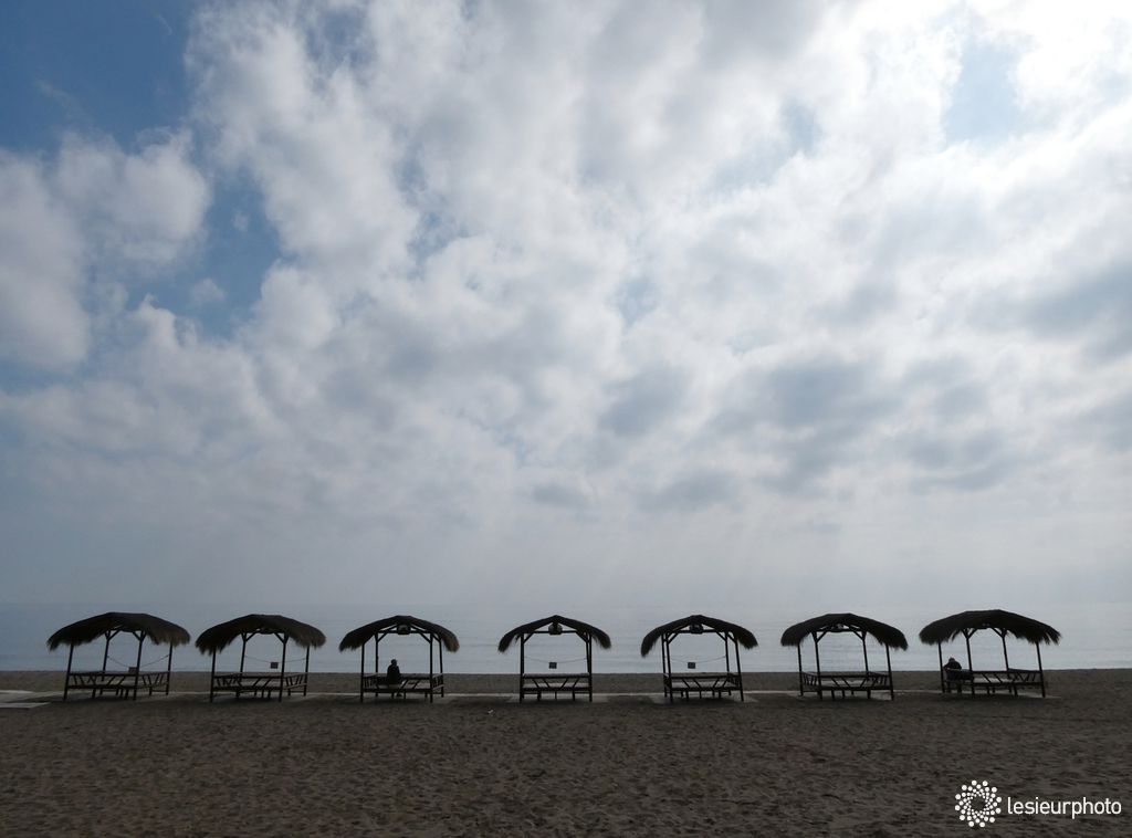 De l'autre côté de la Promenade Maritime et des palmiers, cette invitante rangée d'abris pour se la couler douce.