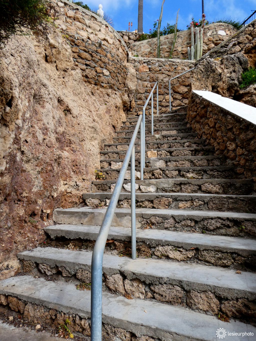 Comme je ne voulais pas prendre le chemin habituel pour monter la falaise, je devais trouver un escalier. J'avais remarqué une grille de fer qui fermait l'entrée d'une de celles-ci près de mon dépanneur ( mercado du coin ) le propriétaire me dit que très peu de touristes utilisait celle-ci et que la grille n'est jamais fermée à clef afin de déservir les résidents du haut de la falaise en tout temps.