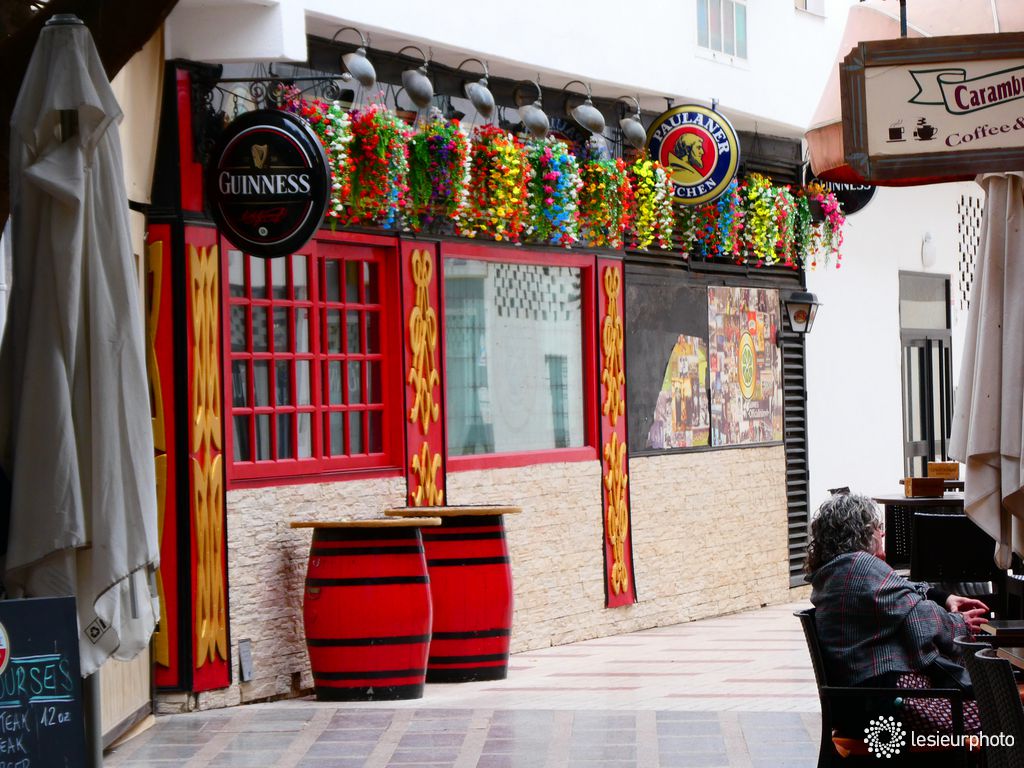 Taverne irlandaise et typique petit café aux apparences andalouses.