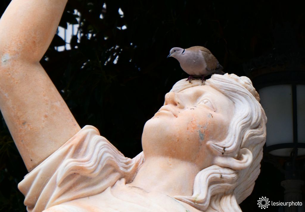 La tourterelle d'Europa. Je suis passé trois fois en une heure pour refaire une photo de cette sculpture sous une autre lumière pour la mettre en valeur. La tourterelle toujours présente.