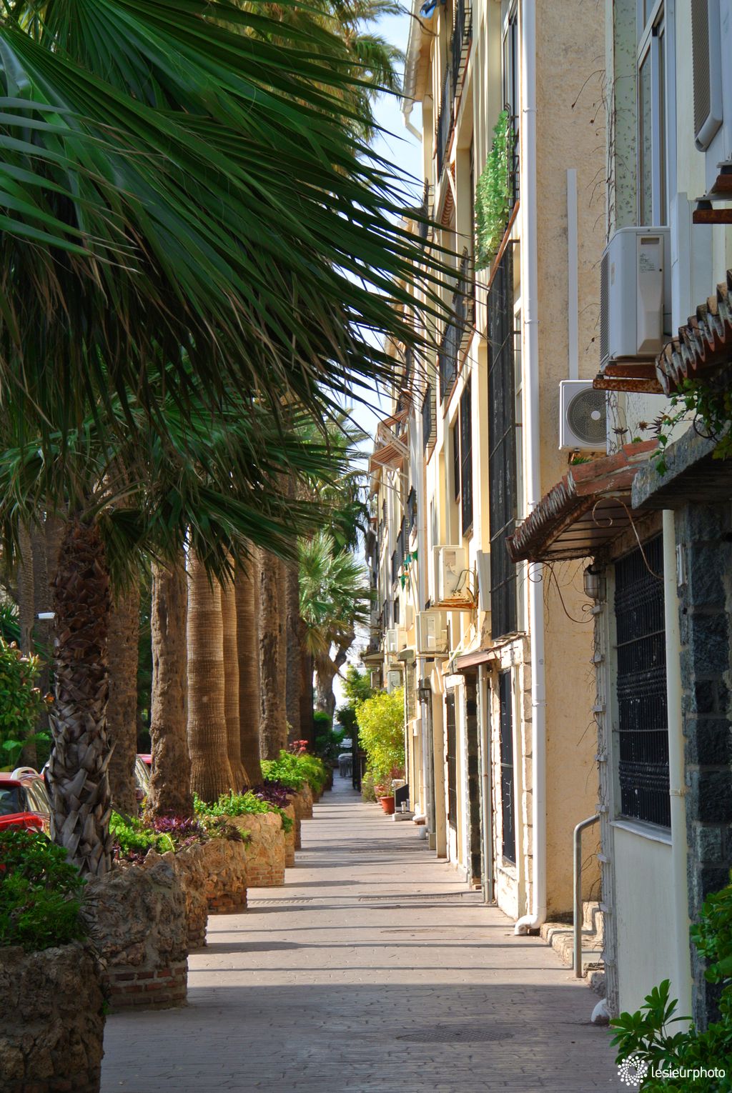 Un trottoir bien agrémenté par de longs et hauts palmiers.